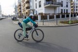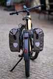Eine Frau schiebt ein E-Bike über einen Gehweg vor einer Häuserzeile mit Geschäften.