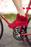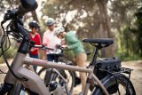 Eine Hand mit Handschuh greift nach dem Griff an einem Fahrradlenker.