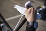 Die Hand einer Rad fahrenden Person am Fahrradlenker.