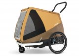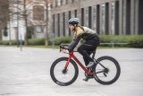 Eine Frau steht mit einem gelben Liegerad mit Versicherungskennzeichen am Gepäckträger vor der Skyline einer Großstadt.