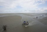 Draufsicht auf zwei Personen, die auf Fahrrädern mit Gepäck auf einer Straße fahren.