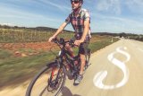 Zwei Personen fahren in dieselbe Richtung auf Fahrrädern durch die Stadt ? eine auf der Fahrbahn und eine auf dem geteilten Fuß- und Radweg.