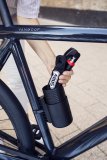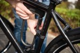 Detailaufnahme einer Person, die mit einem Faltschloss das Vorderrad und den Rahmen eines Fahrrads an einem Fahrradständer anschließt.