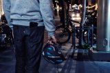Eine Person schließt ein Fahrrad mit einem dünnen Stahlseil an einem Geländer an.