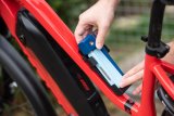 Eine Frau kniet neben einem E-Bike und setzt den Akku in den Rahmen ein.