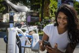 Blick über die Schulter einer Person, die ein Smartphone vor eine Bügelschloss hält, mit dem ein E-Bike an ein Geländer angeschlossen ist.