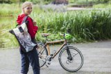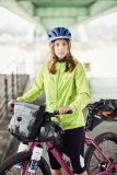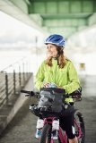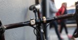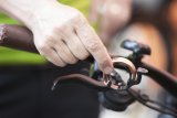 Eine Person hält ein Laufrad an der Nabe vor sich und greift die Mutter eines Schnellspanners mit zwei Fingern.