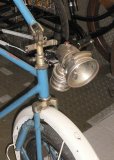 Eine Frau hält zwei Fahrradscheinwerfer vor sich.