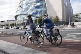 Ein Junge überquert auf einem Fahrrad eine Kreuzung.
