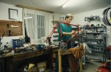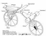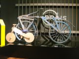 Ein Kind mit einem Laufrad vor einem Mann mit einem historischen Laufrad aus Holz.