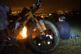Eine Person tippt mit dem Finger auf das Display eines Smartphones oder Navigationsgeräts in einer Klarsichthülle auf dem Deckel einer Lenkertasche eines Fahrrades.