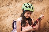 Ein Mädchen mit und eins ohne Fahrrad stehen am Straßenrand und schauen nach Autos, bevor sie die Straße überqueren.