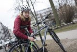 Ein Mann setzt einen Bolzenschneider an einem Bügelschloss an, mit dem ein Fahrrad an einem Metallpfosten gesichert ist.
