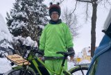 Ein Mann in einem Frosch-Kostüm fährt auf einem Fahrrad mit Kinderanhänger auf einer schneebedeckten Fahrbahn.