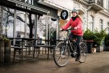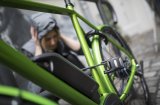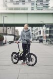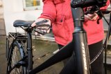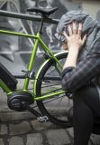Ein grünes E-Bike, mit einem Faltschloss angeschlossen.