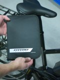 Eine Person hält eine Mappe mit dem Logo des Fahrradherstellers Stevens vor ein Fahrrad.