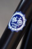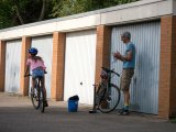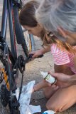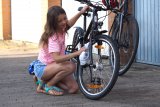 Ein Kind nimmt das Schloss von der Sattelstütze eines blauen Fahrrades in einem Fahrradständer.