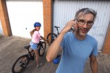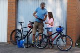 Ein Mädchen mit und eins ohne Fahrrad treten vom Gehweg auf die Straße.