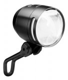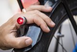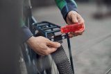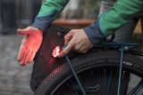 Eine Person schaltet den Scheinwerfer an der Gabel eines Fahrrades an und hält eine Hand in den Lichtschein.