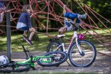 Ein Mädchen setzt an, mit dem Fahrrad loszufahren. Im Hintergrund fährt ein anderes Kind.