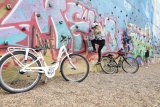 Zwei Mädchen stehen mit Fahrrädern herum, eine mit Helm auf den Kopf und eine mit dem Helm am Lenker hängend.