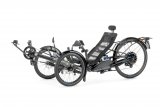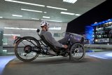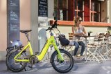Eine Frei steigt mit einem E-Bike mit kleinen Rädern in einen Zug ein.
