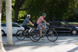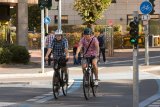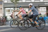 Zwei Personen auf Fahrrädern mit Licht und reflektierenden Elementen an den Fahrradtaschen vor vielen Lichtern einer Großstadt.