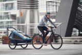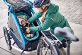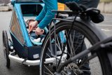 Eine Frau hockt vor einem Kinderanhänger an einem Fahrrad und greift hinein.