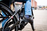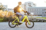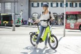 Eine Frei steigt mit einem E-Bike mit kleinen Rädern in einen Zug ein.