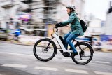 Ein Mann steht in der Natur neben einem E-Bike und betrachtet es.