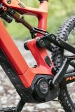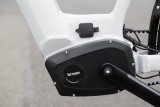 Eine Person schließt ein Ladekabel am Rahmen eines E-Bikes an.