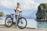 Ein E-Bike ist neben einer nassen Straße abgestellt. Im Vordergrund sitzt eine Person mit Fahrradhelm und schaut auf ihr Smartphone.