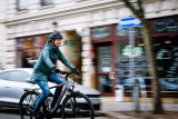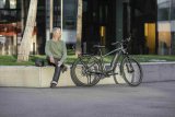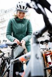Ein E-Bike ist neben einer nassen Straße abgestellt. Im Vordergrund sitzt eine Person mit Fahrradhelm und schaut auf ihr Smartphone.