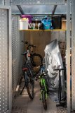 Ein Mann platziert ein E-Bike in einer Garage an einer speziellen Wandaufhängung für Fahrräder.