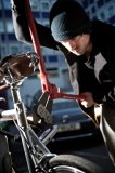 Ein Mann setzt einen Bolzenschneider an einem Bügelschloss an, mit dem ein Fahrrad an einem Metallpfosten gesichert ist.