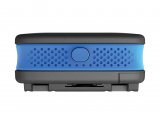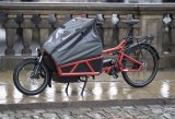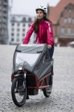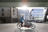 Eine Frau steht am Straßenrand vor einem Fahrrad und schaut auf ihr Smartphone.
