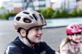 Ein Mädchen und ein kleinerer Junge fahren auf Fahrrädern. Das Mädchen lächelt dem Jungen zu und hat eine Hand auf seiner Schulter, um ihn zu unterstützen.