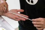 Eine Person hält ein anatomisches Modell einer menschlichen Hand vor sich.