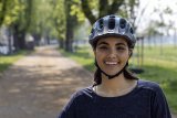 Ein Mann fährt auf einem Fahrrad durch die Stadt