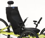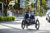 Ein Mechaniker arbeitet an einem Fahrrad oder Liegerad mit Hinterradmotor.
