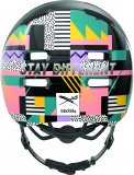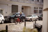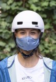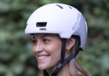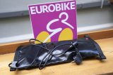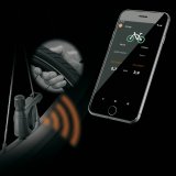 Eine Person hält ein Smartphone vor einen Fahrradreifen, an dessen Ventil ein kleines, schwarzes Gerät montiert ist.