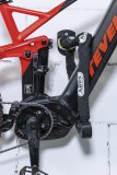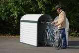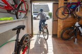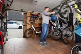 Ein Mann platziert ein E-Bike in einer Garage an einer speziellen Wandaufhängung für Fahrräder.