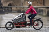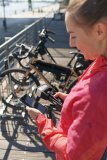Eine Frau steht am Straßenrand vor einem Fahrrad und schaut auf ihr Smartphone.