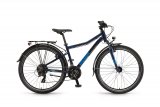 Ein Mann und ein Kind fahren auf Fahrrädern einen gepflasterten Weg entlang.