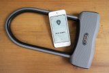 Blick über die Schulter einer Person, die ein Smartphone vor eine Bügelschloss hält, mit dem ein E-Bike an ein Geländer angeschlossen ist.