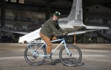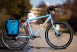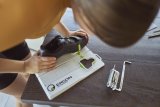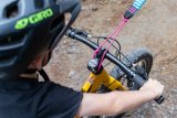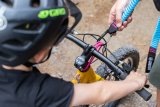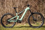 Eine Person fährt auf einem E-Bike einen felsigen Weg im Wald hinab.
