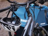 Eine Frau hockt vor einem Kinderanhänger an einem Fahrrad und greift hinein.