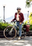 Eine Frau steht mit einem Lastenrad und Einkauf in der Ladebox in einer innerstädtischen Umgebung.