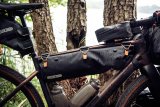 Zwei Personen fahren auf einer nassen Straße in einem Tal im Wald auf den Betrachter zu.