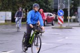 Ein Lastenradfahrer überquert eine Straße innerhalb einer Fahrbahnmarkierung. Ein Auto wartet im Hintergrund.